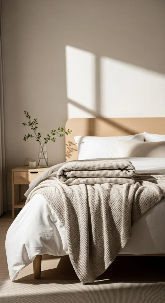 A single lightweight throw adds comfort without clutter. Choose breathable fabric such as cotton or a thin knit. Neutral or muted colors work best for a restful look.