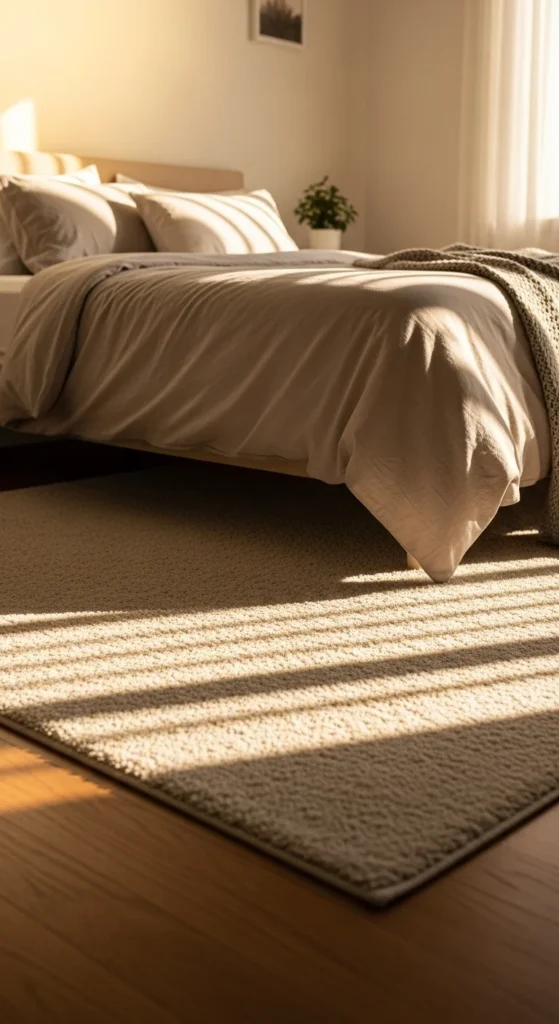 Keeping rugs simple helps the bedroom feel grounded without visual noise.