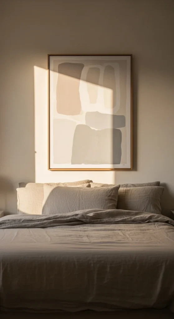 Minimal wall decor helps the bedroom feel settled and quiet.