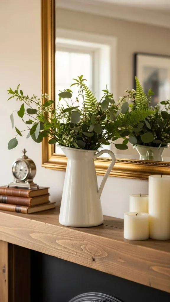 Fill them with clipped branches from your yard or faux stems from a thrift store. Avoid tight floral arrangements. Let the greenery spread naturally. A single branch leaning outward feels intentional.