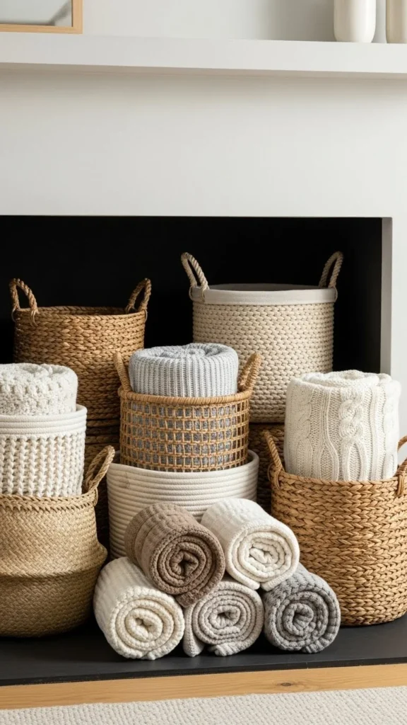 You can store throw blankets, magazines, or even faux logs made from rolled fabric.