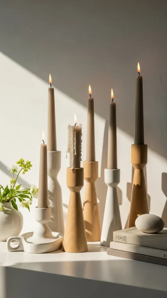 Candlesticks still work beyond winter when kept light. Choose ceramic, wood, or matte stone finishes.