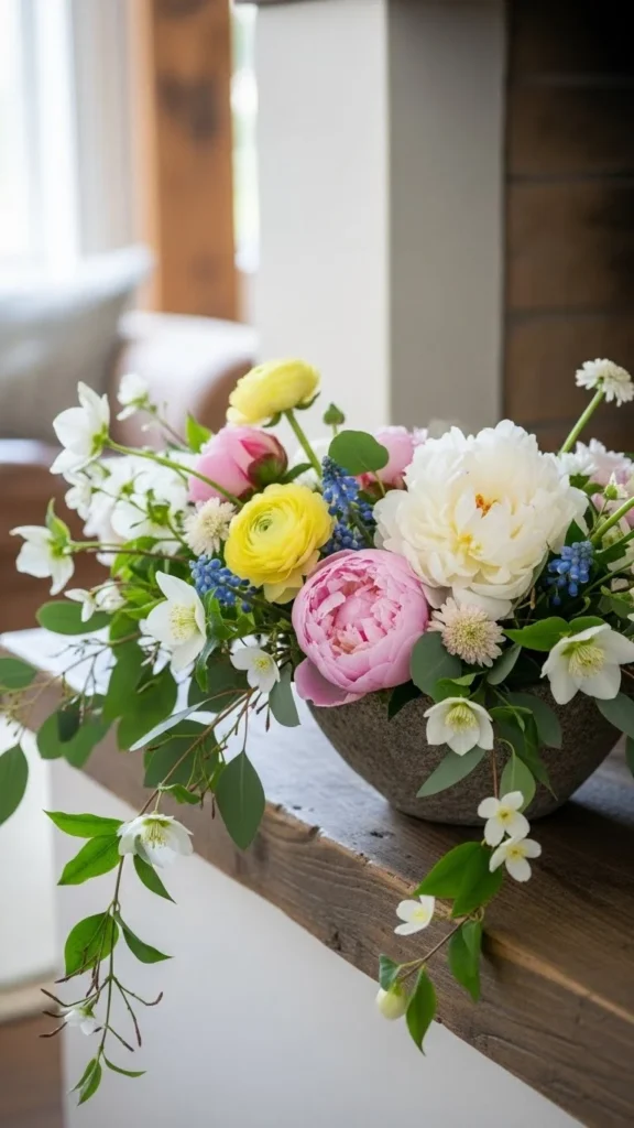 Use a mix of faux and real stems if needed. Keep colors muted. Soft greens, whites, and blush tones work well.