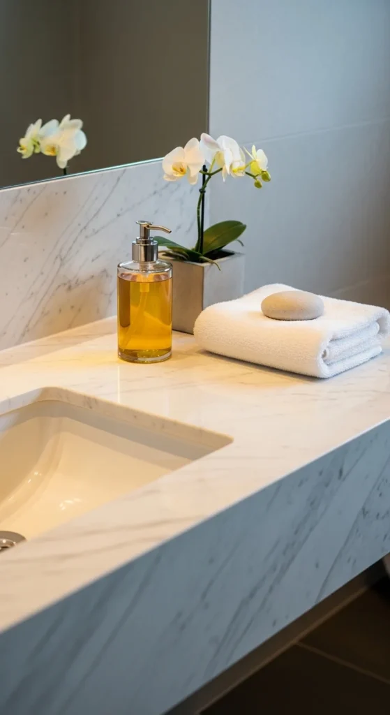 Clear bathroom counters look clean and intentional. Limit items to daily essentials.