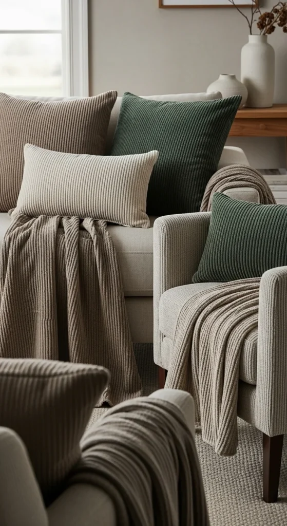 Repeat materials like linen or cotton across pillows and throws.