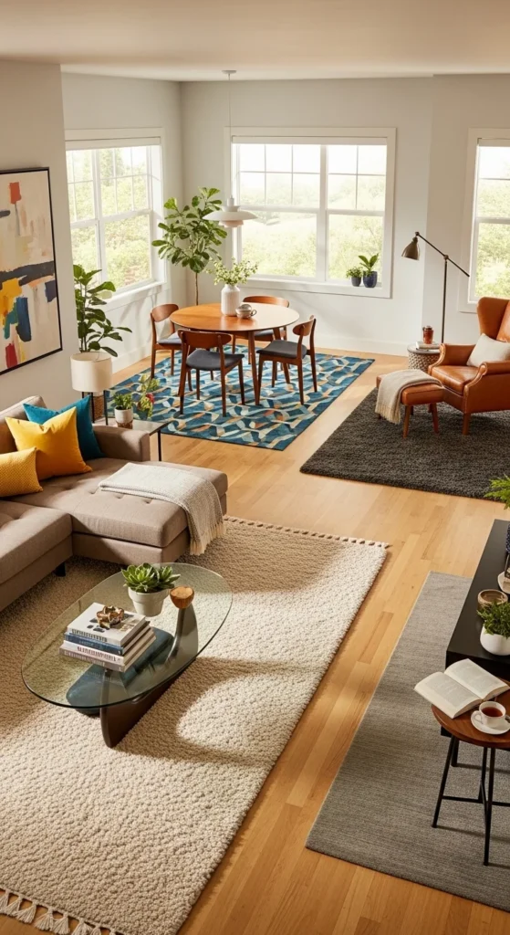 Open spaces need visual structure. Rugs and furniture placement help define areas.