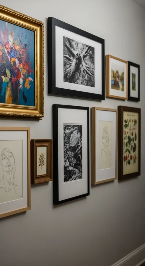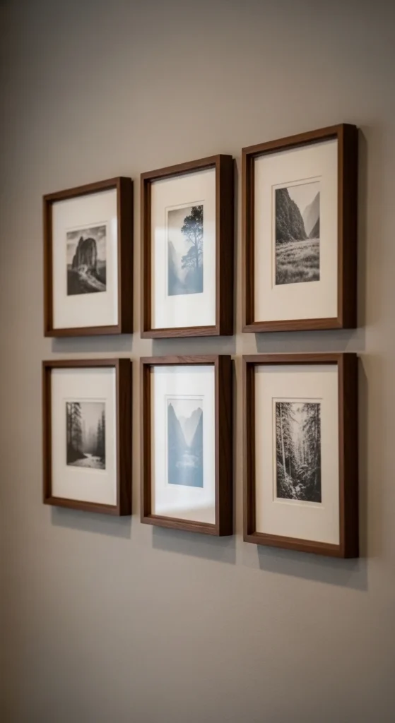 Matching frames create cohesion. Even inexpensive frames look better when consistent.
