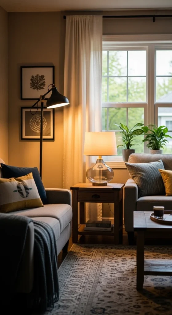 One overhead light rarely looks polished. Layered lighting changes everything. Combine floor lamps, table lamps, and window light for balance.