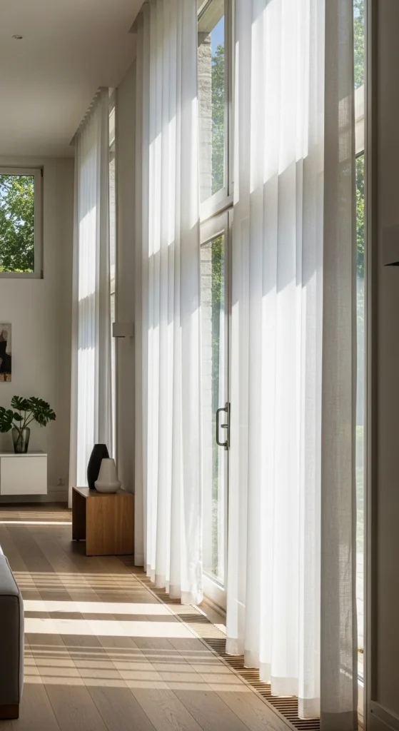 Window treatments frame a room. Simple panels in light fabrics look clean and professional. Hang them higher than the window to add height.