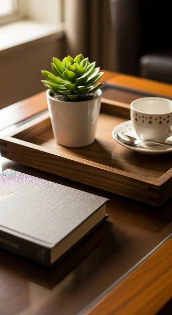 Professional coffee tables follow a rule of three. One tray, one book, one object. This keeps things tidy and balanced.