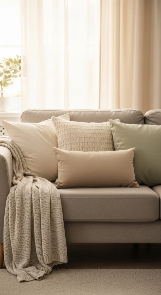 Layering a sofa with soft neutrals creates a calm base that works all year. Start with two or three pillows in similar tones, then add one with a gentle pattern for interest. Keep the colors within the same family to avoid visual clutter.