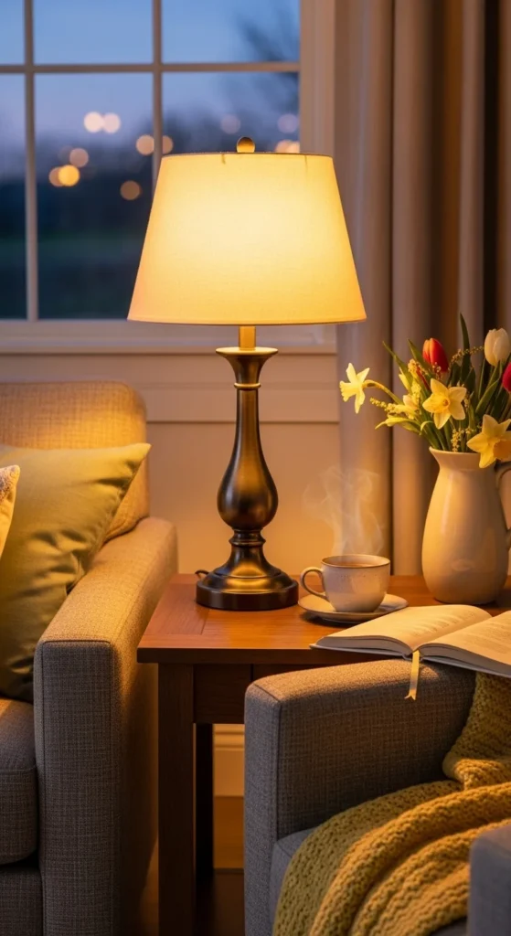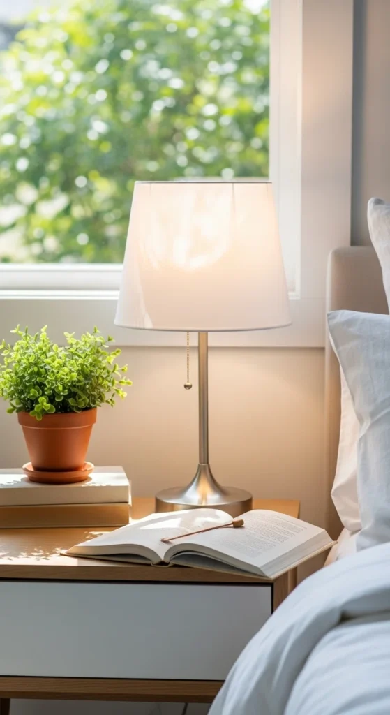 Choose lamps with simple bases and light-colored shades. Warm bulbs create a cozy feel.