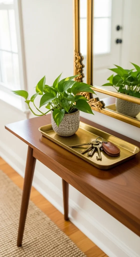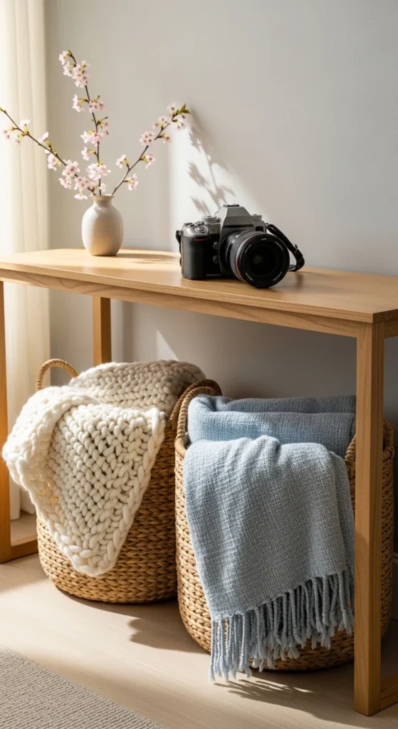 Avoid overcrowding the surface. Negative space helps the room feel calm. If your table has shelves, use baskets to hide clutter.