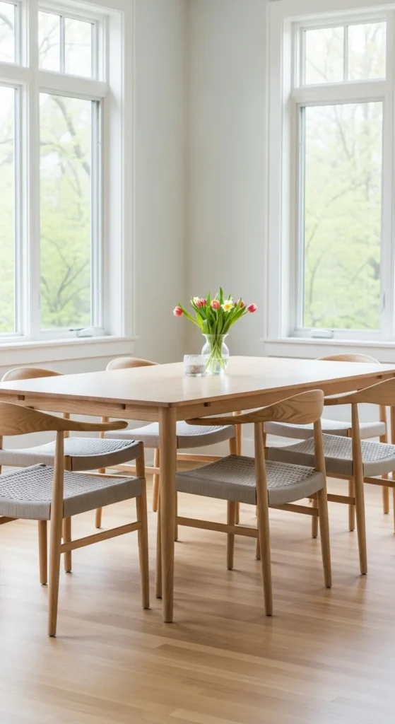 Light wood pairs well with white, beige, and soft gray. It also works with muted pastels. Simple table styling keeps the room grounded and functional.