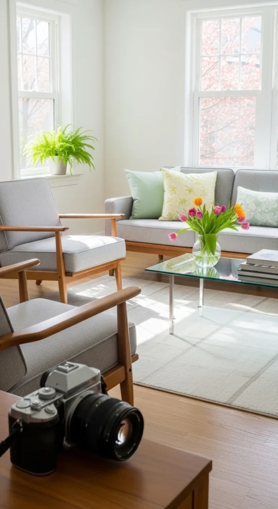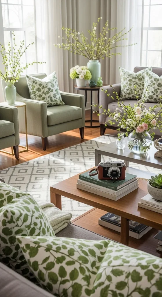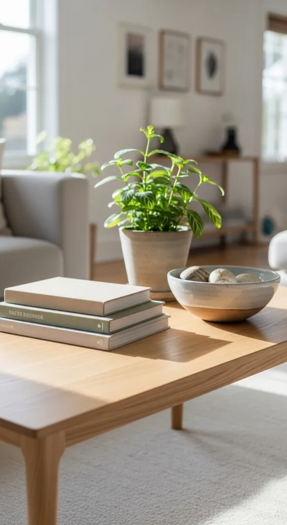 A light wood coffee table naturally suits spring decor. Keep styling minimal to maintain balance. Start with one small stack of books or magazines as a base.
