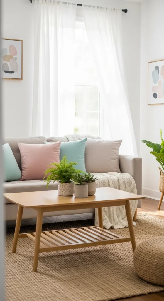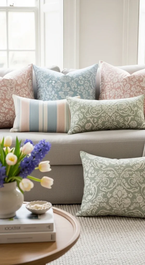 Pastel pillows introduce gentle color without overwhelming the room. Choose one or two shades and repeat them elsewhere for cohesion.