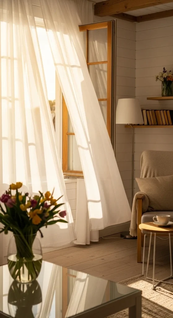 Sheer curtains instantly make a room feel lighter. They filter sunlight without blocking it, creating a soft glow.
