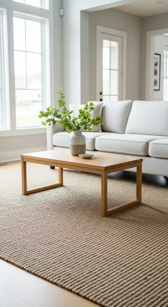 A neutral rug anchors furniture and ties elements together. Look for beige, cream, or light gray tones with subtle texture.