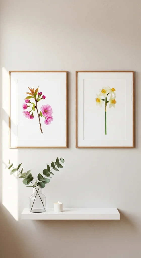 Choose two or three pieces that share a theme or color palette. Botanical prints, soft landscapes, or abstract neutrals work well.
