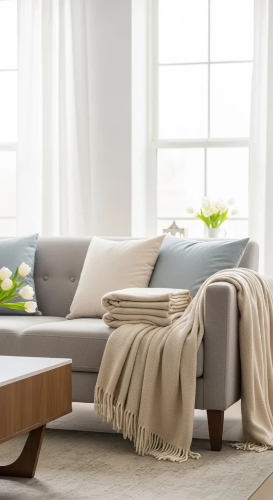 Switch out dark winter throws for lighter shades. Cotton or thin knits feel appropriate for warmer months.