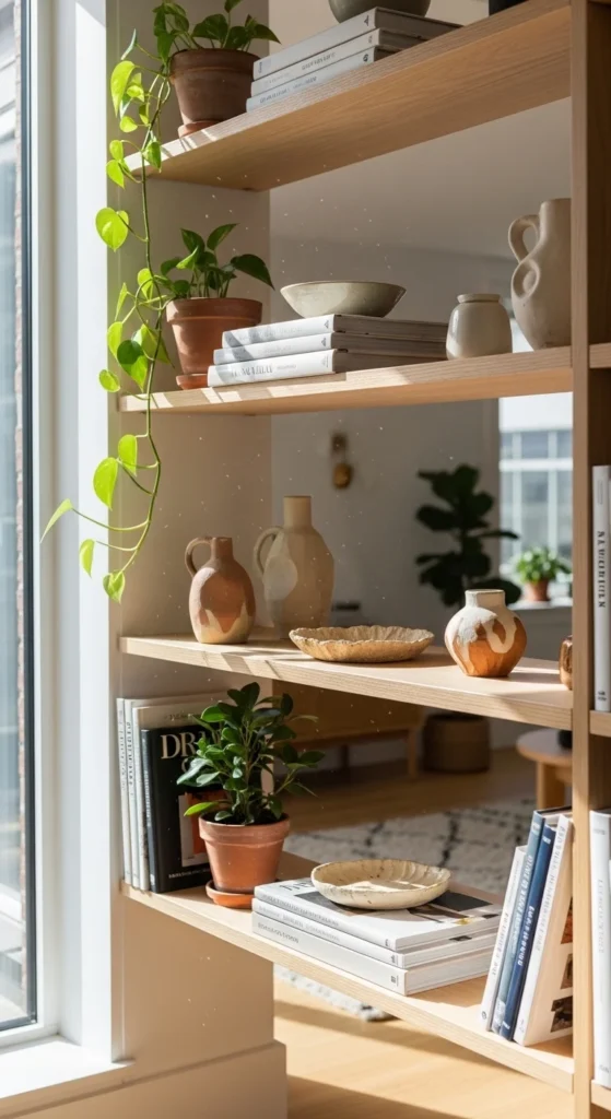 Open shelves look best when not overfilled. Use a mix of functional and decorative items.