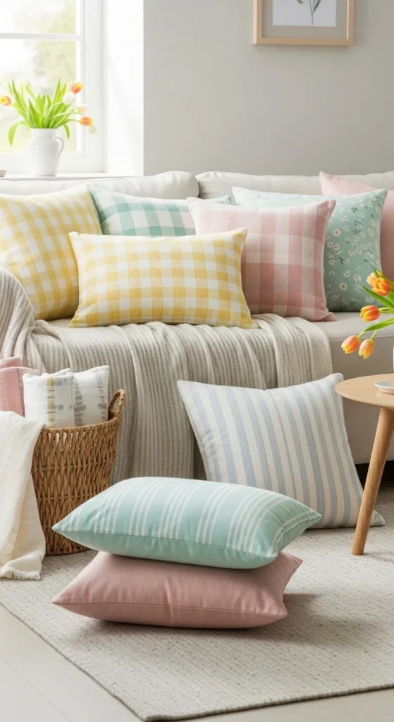 Washable covers are practical for everyday use. Simple textures like subtle stripes or small weaves add interest without taking over the space. Keep pillow sizes mixed but balanced.
