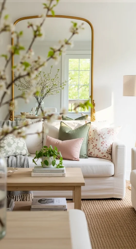 Heavy knit or velvet pillows can make a living room feel closed in once the weather changes. Switching to lighter fabrics is an easy win. Cotton, linen, or canvas covers instantly feel more relaxed. Stick with light neutrals or gentle patterns to keep the room open.