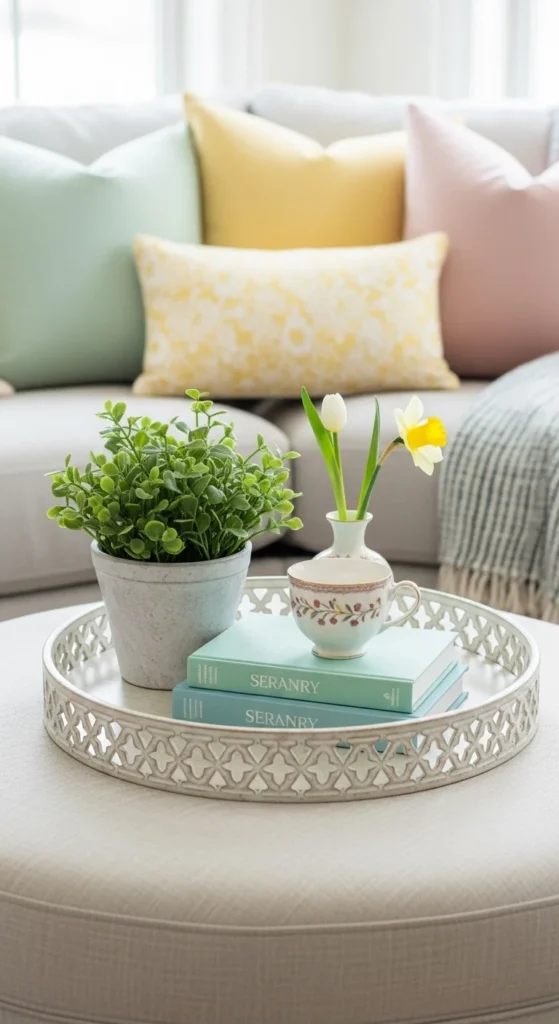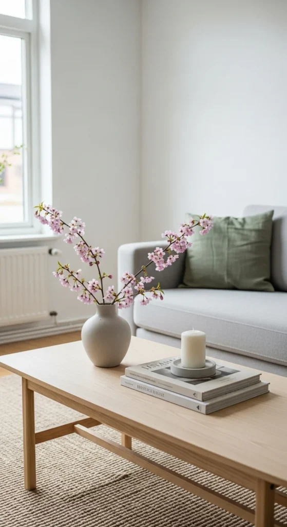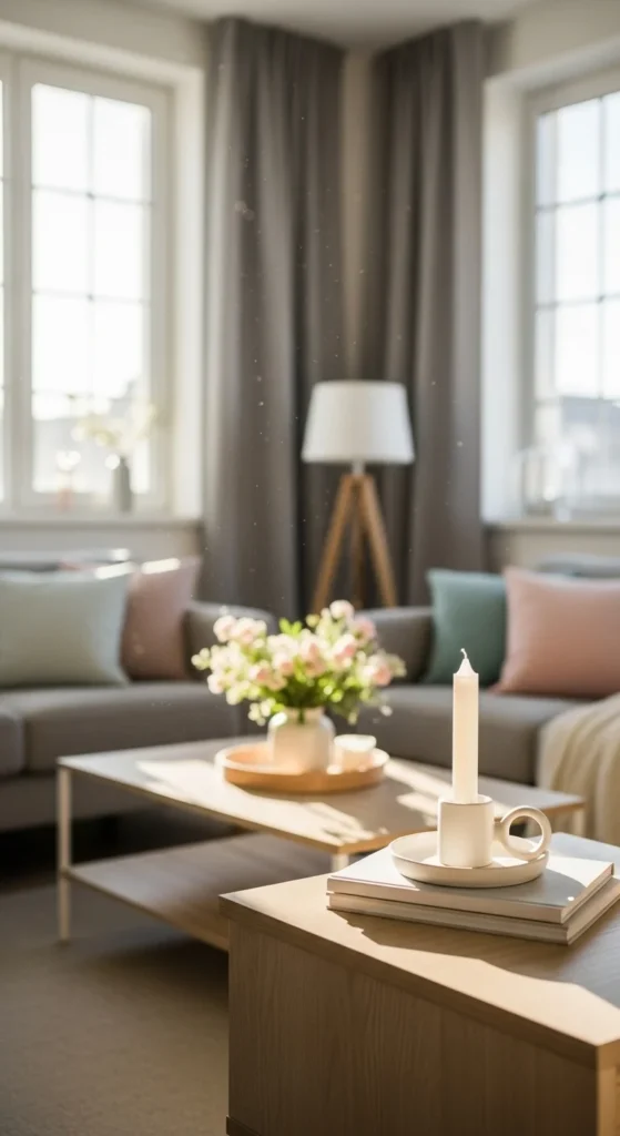 A crowded coffee table can make the room feel busy. Clear everything off and start with just two or three items. A small tray, a book, and a simple object work well.