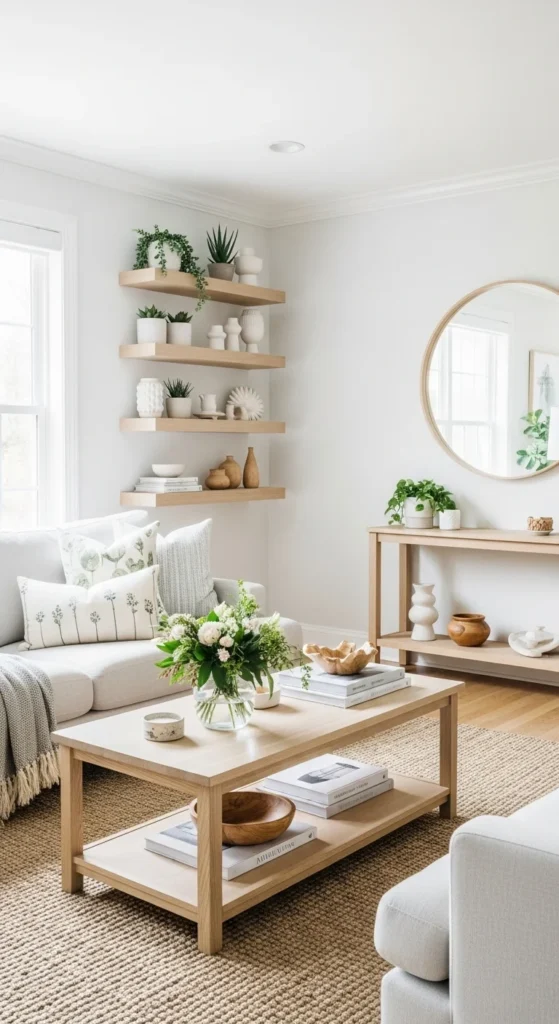 Light wood feels warm without heaviness. Add trays or small stools.