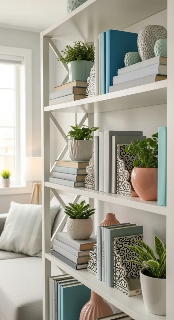 Group items in odd numbers and vary heights. Remove anything that feels bulky or overly dark. Clear surfaces help the room feel lighter.