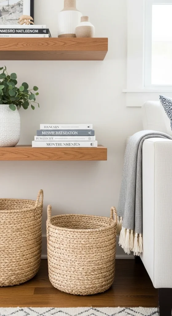 Baskets hide clutter neatly. Use them for throws or magazines.