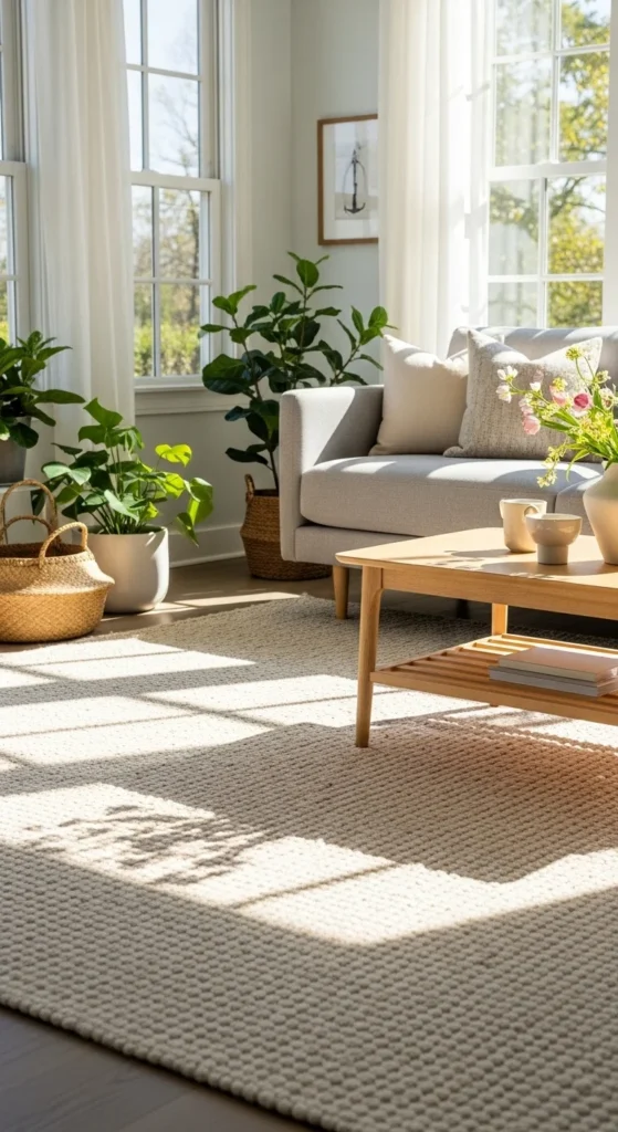 Dark rugs can feel heavy once daylight hours increase. Switching to a lighter rug helps brighten the entire space. Look for low-pile options in beige, cream, or soft gray.