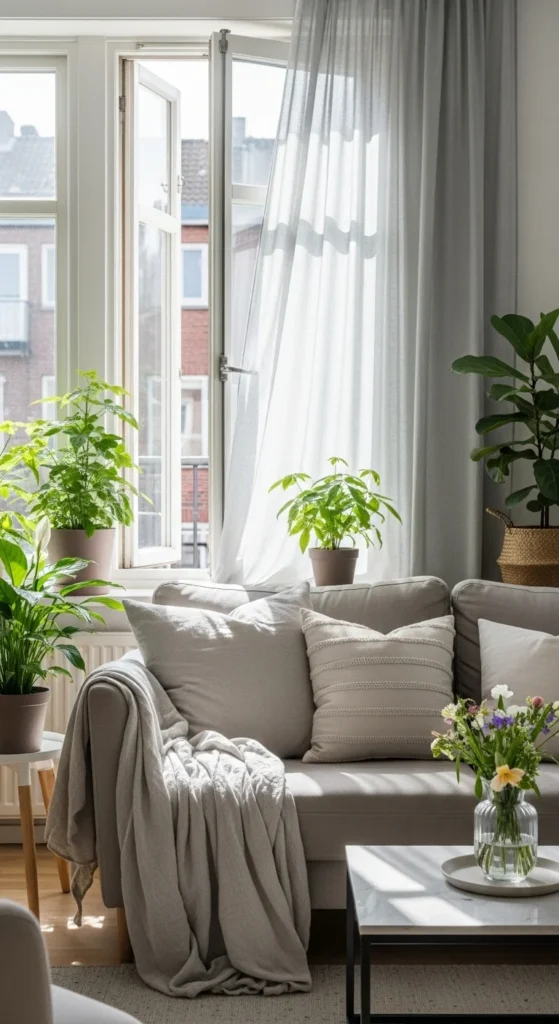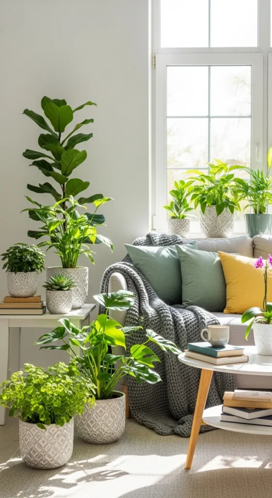 Plants bring life into a living room instantly. Even one or two can make a noticeable difference. Choose easy-care options like snake plants or pothos.