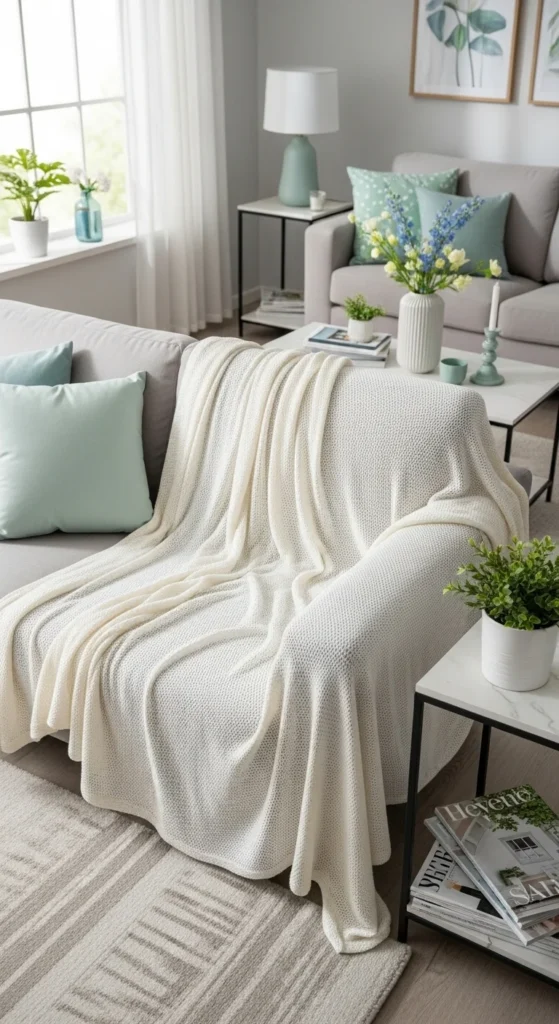 Thick throws are great in winter but feel out of place later. Swap them for cotton or waffle-knit throws. These add texture without weight.