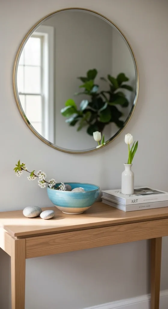 Use one mirror or art piece above. Add one functional item like a bowl.