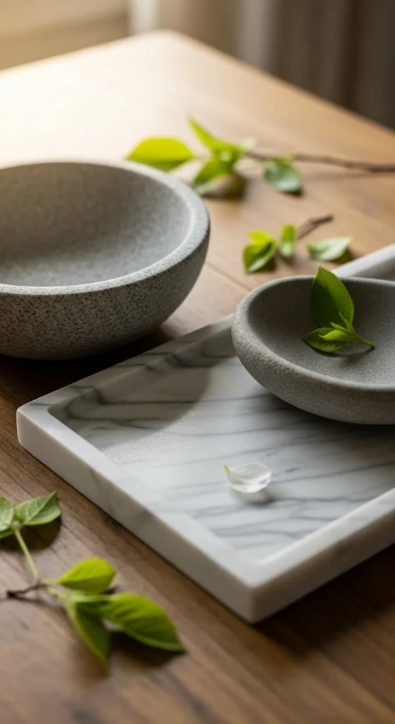 Stone accessories add weight and calm. Use sparingly.