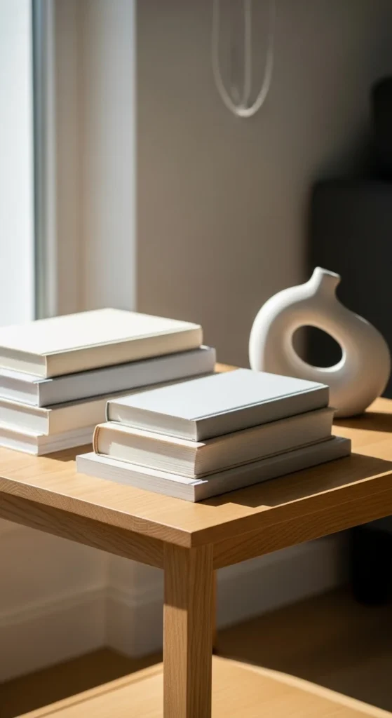 Books bring warmth and personality. Choose covers with calm colors. Remove dust jackets if they feel busy.