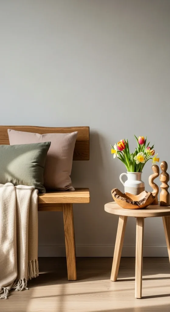 Natural wood brings warmth to spring spaces. Look for pieces with visible grain and simple shapes.