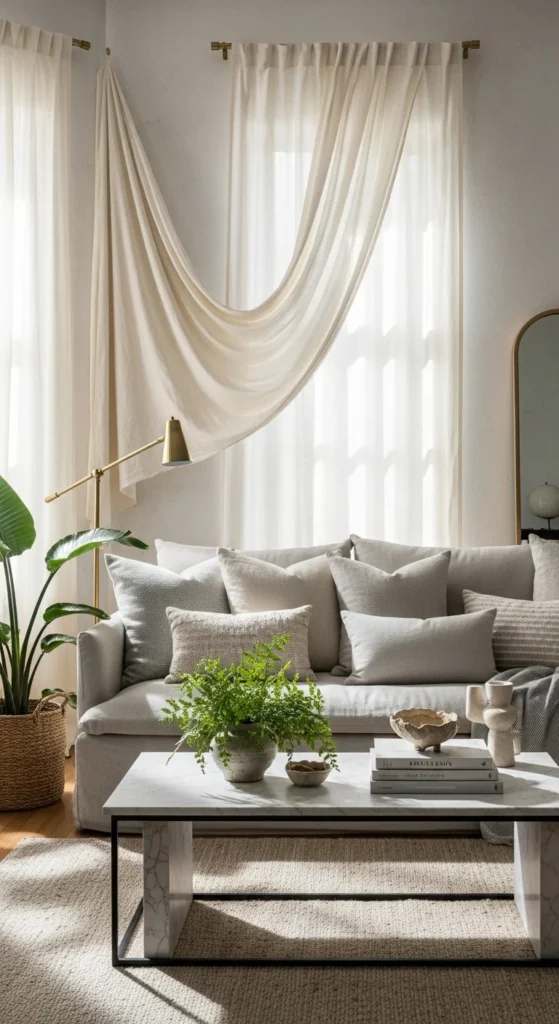 Layer sheers with heavier panels for depth. Keep rods mounted higher than the window frame to create height.