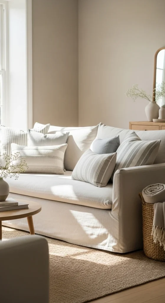 Style the sofa with pillows in similar tones but different textures. Think cotton, subtle stripes, or soft knits. Keep patterns minimal. The focus stays on comfort and ease rather than decoration.
