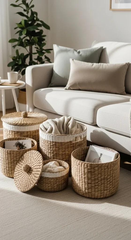 Natural fibers pair well with neutral decor. Place baskets near seating for easy access.