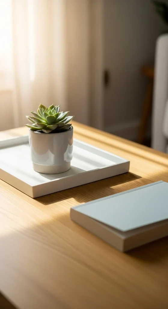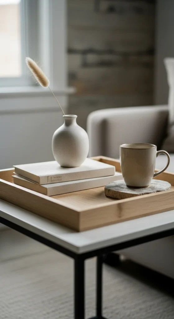 Keep styling minimal. A tray, a small plant, and one book are enough. Leaving some surface visible helps the table feel intentional rather than cluttered.