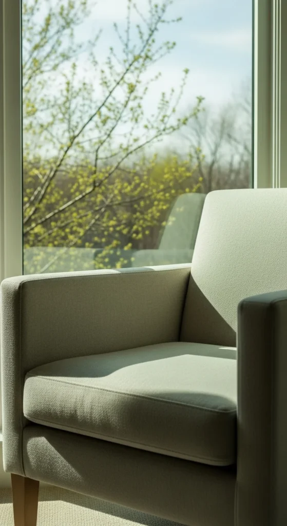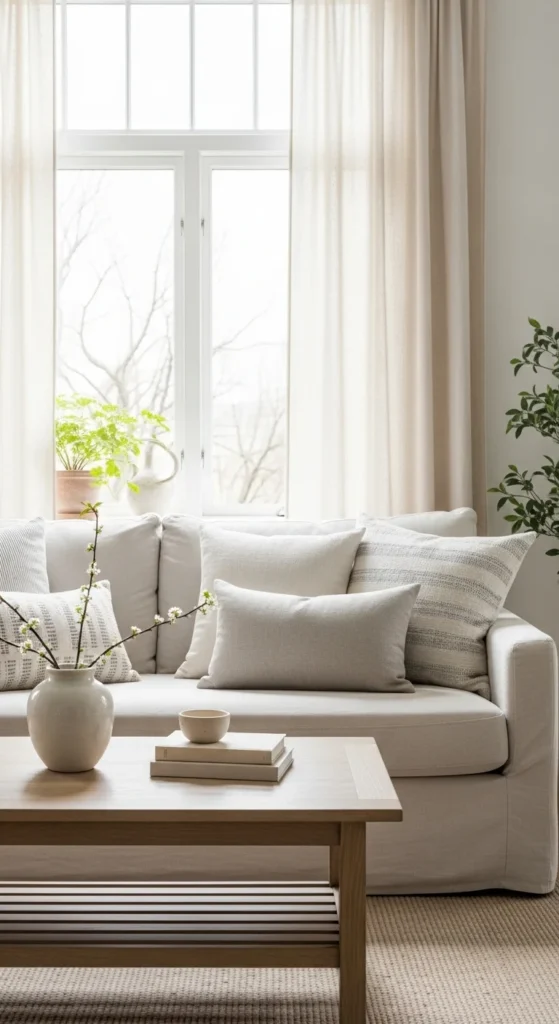 Pillows are one of the easiest updates. Swap heavy covers for linen or cotton in spring-friendly tones. Soft taupe, cream, and light gray work well together.