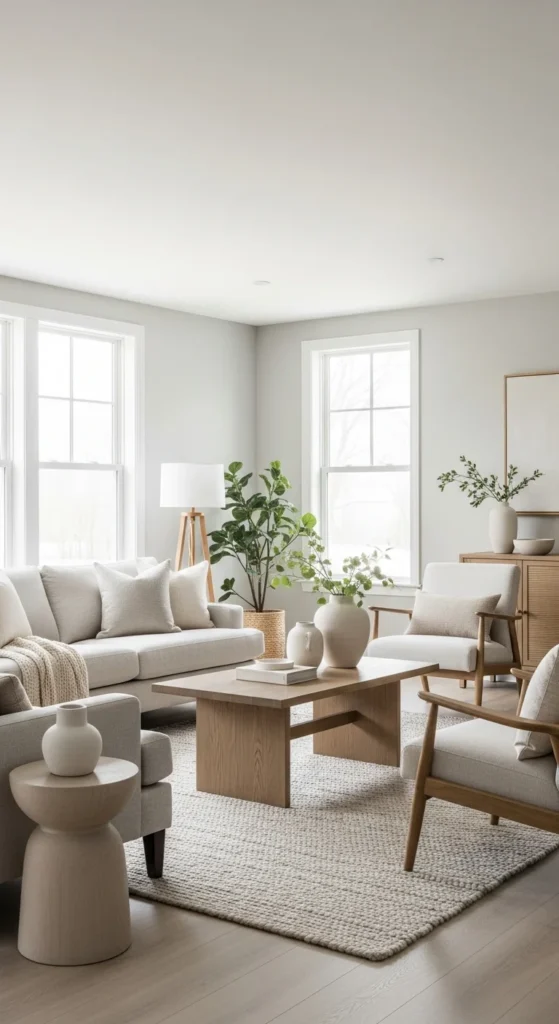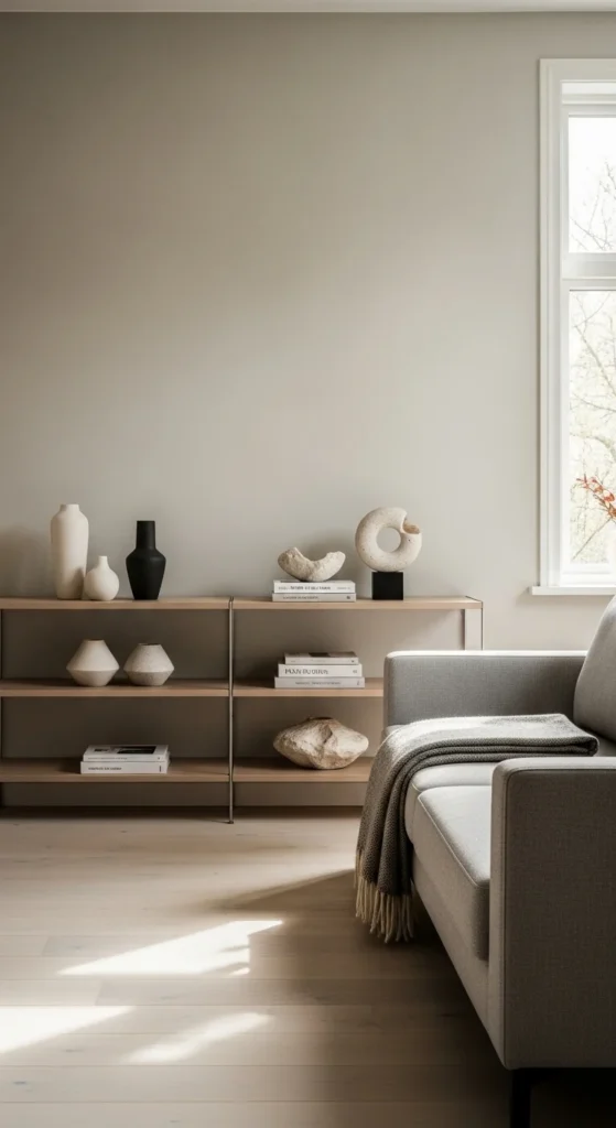 A consistent palette ties the room together. Stick to two or three neutral tones.