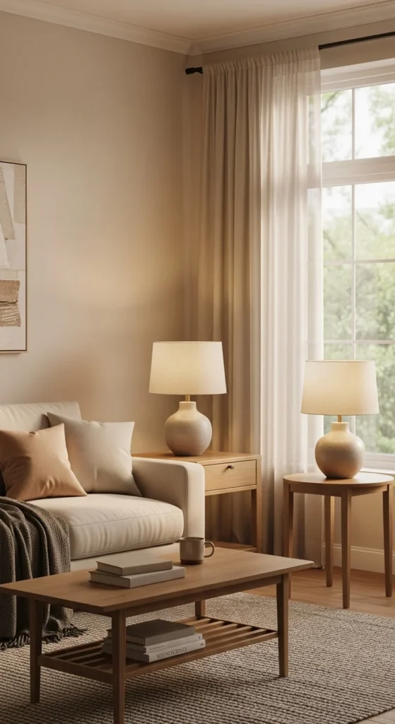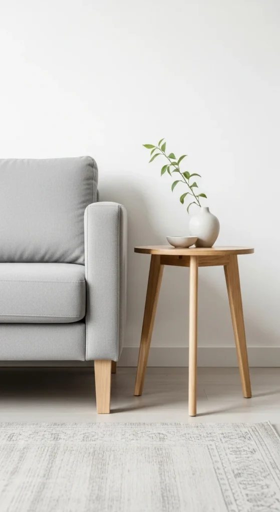 Side tables made from light wood add warmth without visual weight. Choose simple designs with open bases.