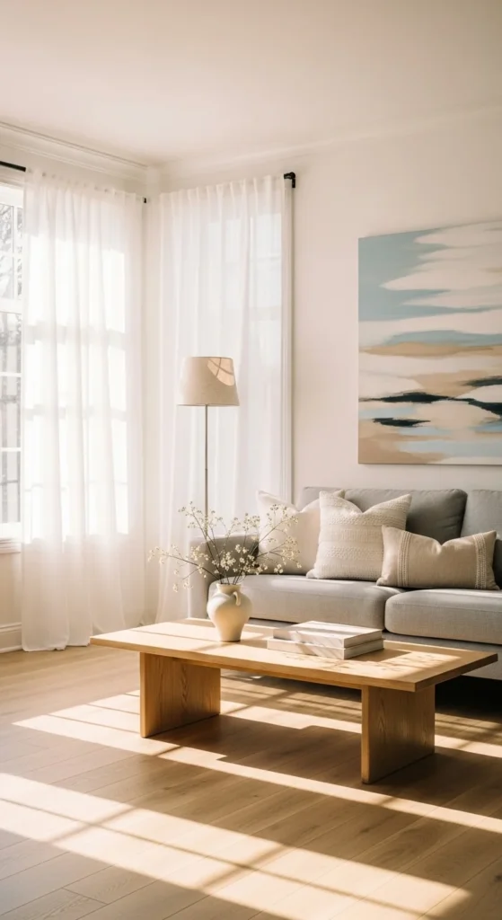 Sheer curtains allow sunlight to move freely through the room. Soft white or light beige panels frame windows without blocking light. They add privacy while keeping the space airy.