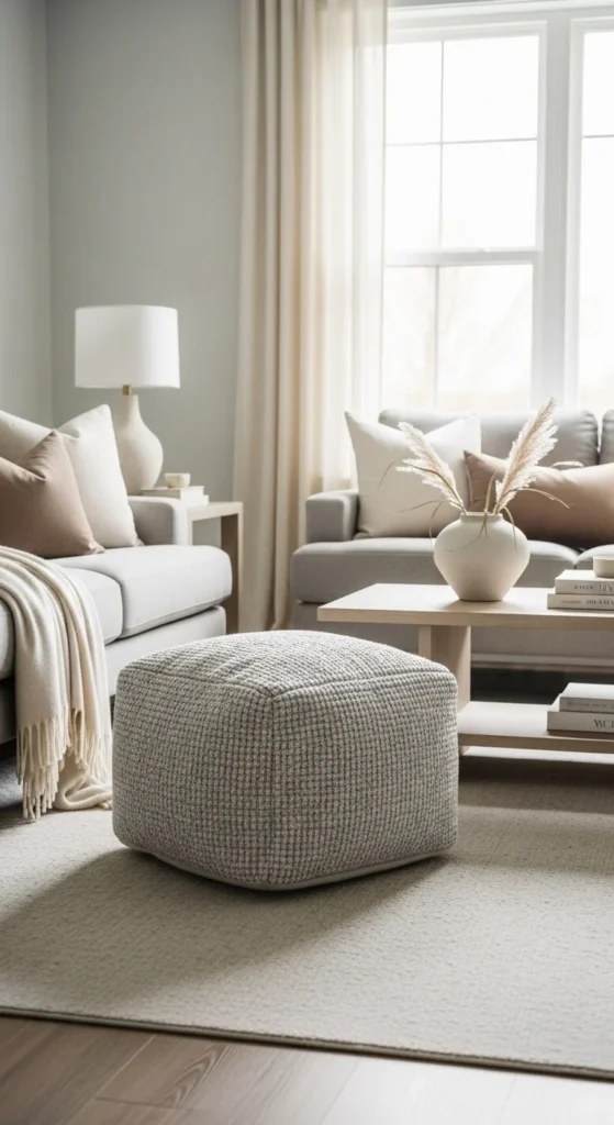 Poufs provide flexible seating and footrests. Choose fabric or woven styles in neutral tones.