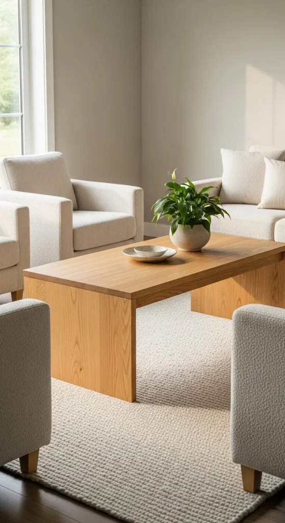 A light wood coffee table grounds a neutral living room without feeling heavy. Pale oak or pine reflects daylight and pairs well with spring decor. Simple shapes work best. Rounded edges feel relaxed and approachable.