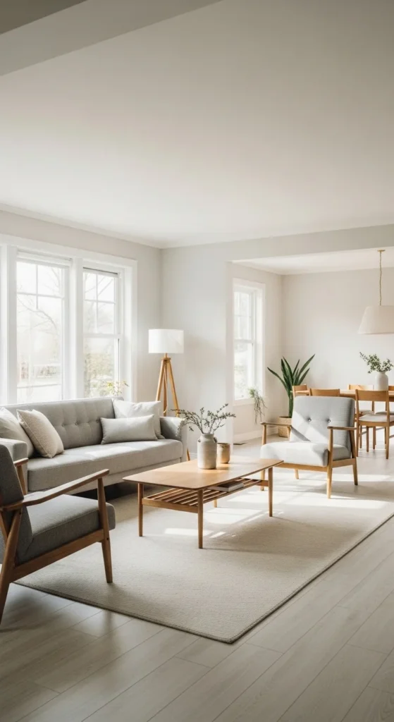 Stick to warm neutrals. Avoid dark borders that visually shrink the room. The goal is openness and flow.