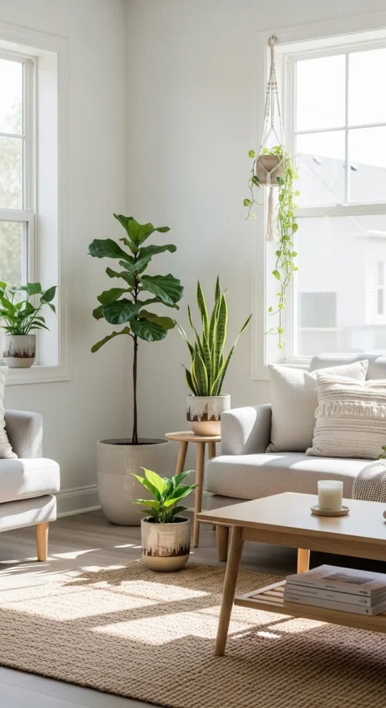 Choose neutral planters. White, beige, or clay tones blend well with the room.